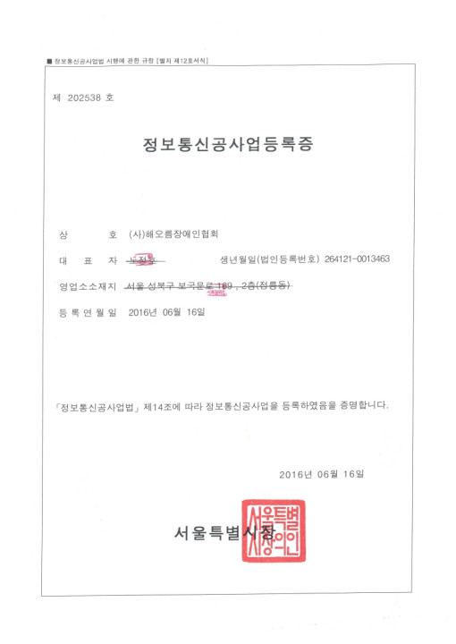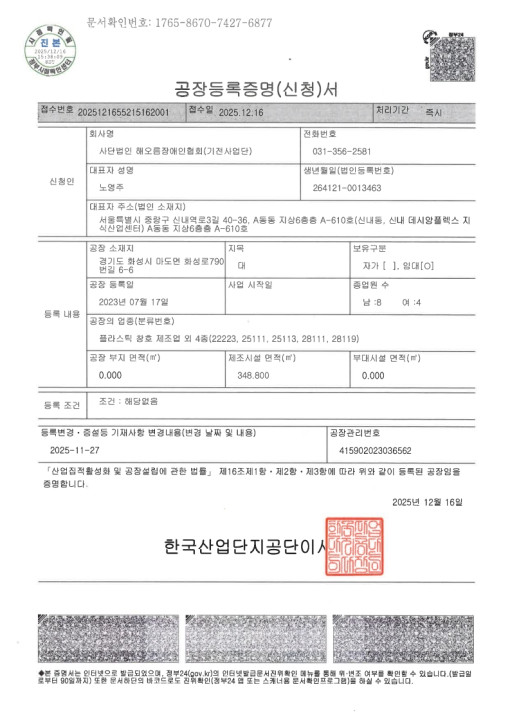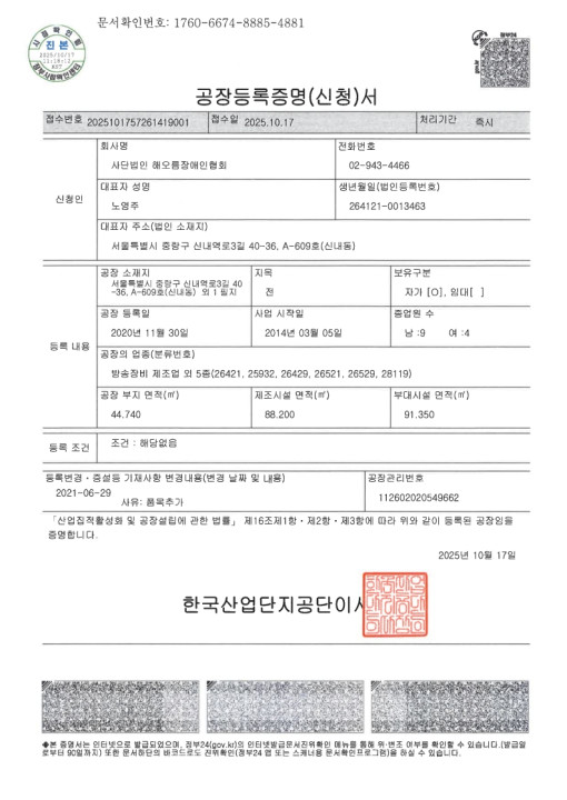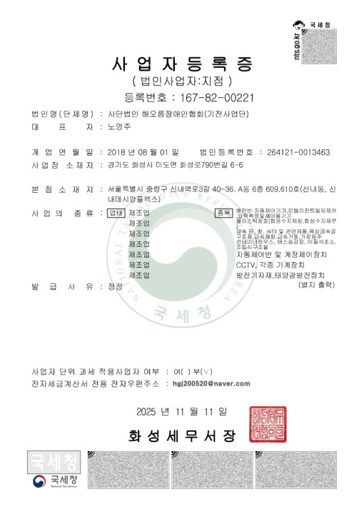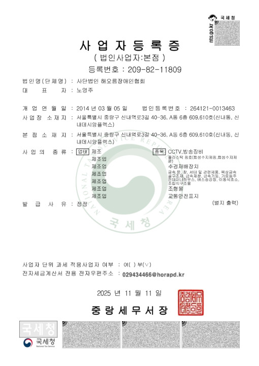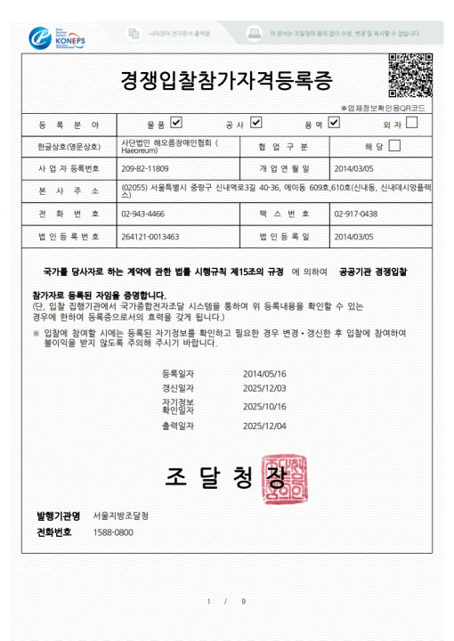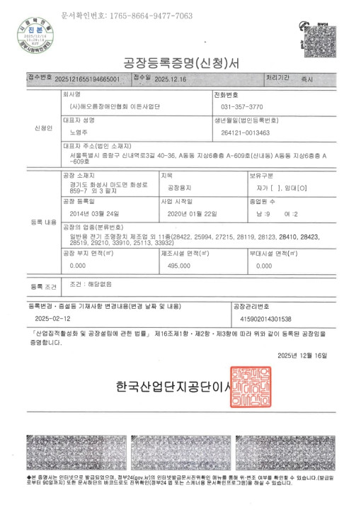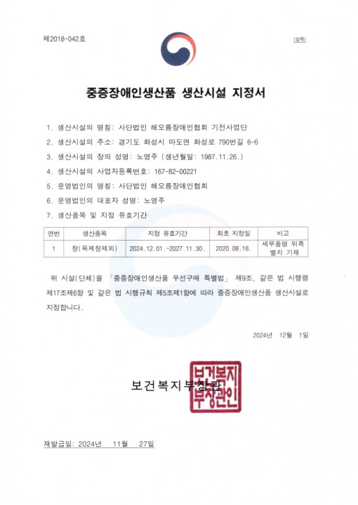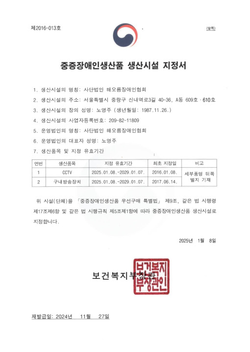 중증장애인생산품 생산시설 지정서(CCTV, 방송장치)