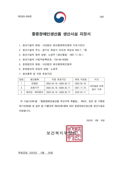 중증장애인생산품 생산시설 지정서(전광판, 조명기구, 배전반)