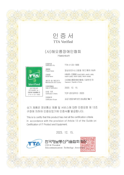 TTA 인증서(HNVR-128B8)
